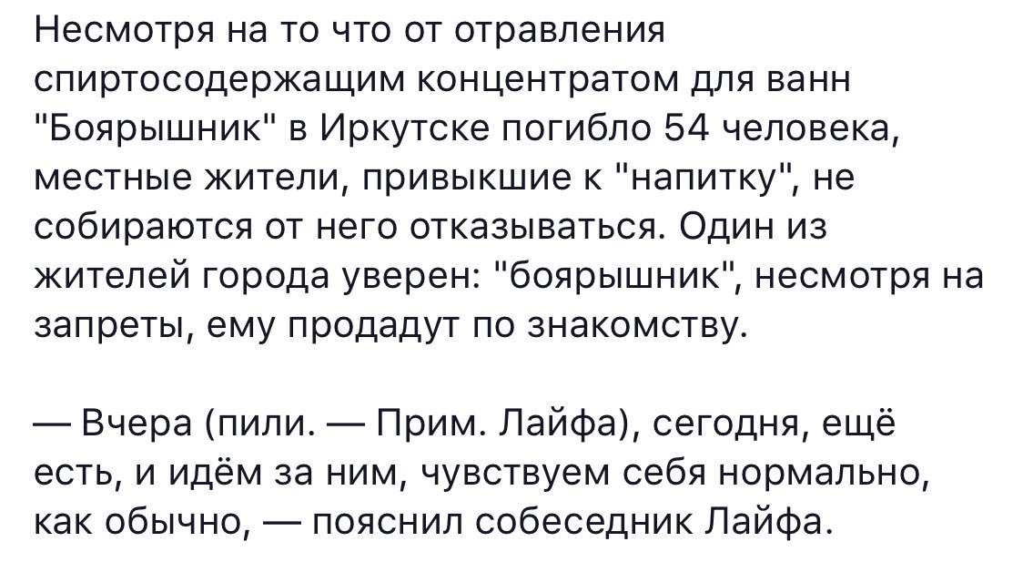 Пишут, что в Иркутске, упившись спиртосодержащей микстурой-политурой "Боярышник" отравилось до смерти чуть не полста россиян. Ещё раз: полста душ упились не поддельной водкой, как это недавно было у нас, а именно спиртосодержащей настойкой.