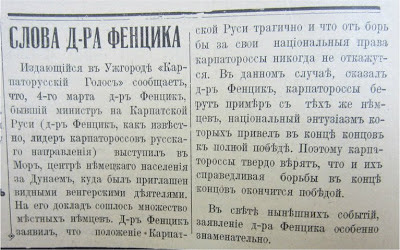 Пока венгерские подразделения гонведов выжидают на пограничных позициях и судьба Рутении [Карпатской Украины] остается неясной, фашистское движение уже распространяет свое влияние по всему краю. Его основатель и вождь - доктор Фенцик в публичной речи заявил о своей цели организовать Рутению в фашистскую пролетарскую систему, где сочетаются итальянский корпоративизм и московская большевистская системы. Степан Фенцик заявил, что он хочет адаптировать свой фашизм к местным условиям и сделать фашизм без террора(!?) ...